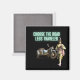 Fun inspirational and quirky magnet features vintage motorcycle with sidecar and costumed woman photo cutouts on black background with neon blue "choose the road less traveled" text.  Be Yourself. Free Yourself.