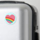 Este diseño clásico de los años 80 presenta un gran corazón rosado con un arcoiris colorido. El fondo es azul claro, pero puedes cambiarlo a lo que quieras.