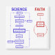 Un diagrama ilustra los diferentes procesos de pensamiento detrás de la ciencia y la fe. Cuando se descubre nueva evidencia, la ciencia la pone a prueba contra las teorías existentes y modifica la teoría para entender mejor el Universo. La religión ignora la evidencia contradictoria en un ciclo infinito de ignorancia.