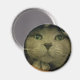Una cara de gatito gris muy linda que aparece en este imán redondo.