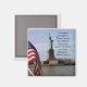 "El coraje es contagioso. Cuando un hombre valiente adopta una posición, las espinas de los demás se endurecen con frecuencia". Billy Graham cita sobre la estatua de la libertad con el imán de fondo de la bandera estadounidense.