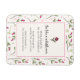 Imán flexible con una cita inspiradora que dice: Sé como una flor silvestre. Lo suficientemente fuerte como para levantarse cuando son pisoteados. Suficiente para capear las peores tormentas. Capaz de florecer en los lugares más rotos. Con un patrón de flores silvestres rosas y verdes como telón de fondo. La cita se coloca dentro de un marco blanco de berenjena con un borde rosa.