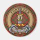 Insignia escudo del clan MacAlister rodeada por una correa y hebilla sobre el fondo del tartán. Texto personalizado.