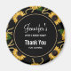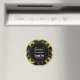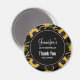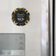 Imán de cumpleaños con un patrón elegante y sofisticado. Hermosas margaritas amarillas y hojas verdes rodeadas de delicadas cadenas doradas. Fondo negro. Un círculo negro con un borde interior dorado falso superpuesto con tu texto dentro.