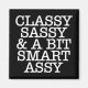 Gráficos de Chica Femenina™ - Imán Classy Sassy y un poco inteligente Assy - Este texto simple, pero elegantemente hermoso con tipografía de máquina de escribir blanca, tipografía divertida en un diseño de fondo negro moderno y elegante hace un regalo de cumpleaños, graduación, boda, Navidad o cualquier día único y divertido para los amigos y familiares que amas. Muchas gracias por su compra. Derechos de autor (c) 2025 gráficos de chica femenina™