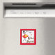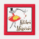 Un imán retro de cocina que lee Kitchen Magician con un brillante tipo de letra retro en negro, rojo y amarillo, y una cocinera con un vestido rojo con una delantal amarilla y su cuchara está goteando chispas sobre el dicho con un borde rojo. Otro original diseño de cocina de MomsRetro.