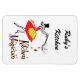 Un imán frigorífico personalizado con letras de guión que leen Kitchen Magician con su mágico chef chica con letras brillantemente retro en negro, rojo y amarillo.