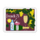 Una elegante imagen Art Déco de viñas y uvas rodea los ingredientes para un 75 francés. Champaña, azúcar, ginebra y limón... tan simple, pero ¡ja ja ja!