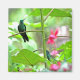 Foto de un colibrí tropical y flores en un jardín en Costa Rica. Este es un hombre de colibrí brillante y coronado verde que muestra sus encantadoras plumas verdes y hermosas hojas verdes y flores rosas que lo rodean. Hay otro colibrí volando en el fondo.