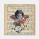 Collage de estilo dulce con fotos tintadas de una niña con alas de mariposa añadidas y ramos de flores sobre fondo de hojas de música antiguas