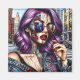 Arte ai único que representa a una bella mujer moderna con cabello púrpura, pintalabios rojos, gafas de sol con un reflejo, arte fracturado en un estilo cómico de arte pop.