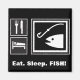 Sorprendentes gráficos de color negro, blanco y gris que representan las necesidades de la vida. Pequeños íconos para comer y dormir usando el cuchillo y el tenedor de servicio de comida estándar, y el techo de alojamiento de motel y las fotos de la cama. Extra gran gráfico de PESCA que muestra la cabeza de un pez y el anzuelo de pesca, por supuesto que la pesca importa más que comer y dormir!