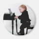 El bebé toca un piano de cola de bebé con una concentración profunda.