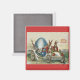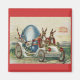 Este imán cuadrado de saludos de Pascua tiene una imagen vintage de dos conejos en un auto blanco antiguo con un gran huevo azul de Pascua en un fondo rojo con el texto Saludos de Pascua.