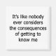 Por el amante del sarcasmo en todos nosotros. Echa un vistazo a este ingenioso diseño "Es como si nadie considerara las consecuencias de conocerme" sobre prendas de vestir y regalos.
