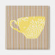 El encantador diseño moderno presenta un fondo de rayas marrones claros con una taza de café amarillo en el centro.