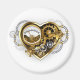 Corazón mecánico, volumétrico, de vapor punk con manómetro de presión, acero y engranajes dorados sobre fondo blanco. Estilo Steampunk.