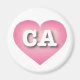 Este imán presenta un fresco corazón rosado con un centro blanco lavado que contiene las letras negrita, blanca y alta del funda CA, la abreviatura oficial de California, el estado dorado.