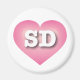 Este imán presenta un fresco corazón rosado con un centro lavado de blanco que contiene las letras en negrita, blancas, fundas superiores SD, la abreviatura oficial de Dakota del Sur, el estado de Mount Rushmore.