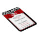 Si has encontrado el amor de tu vida y deseas invitar a todos tus familiares y amigos a presenciar la unión de tus dos vidas y corazones, entonces este hermoso imán de "save the date" de boda en damasco negro y blanco con corazones unidos sobre una cinta roja y una imagen de lazo que recorre la parte superior es una excelente manera de anunciar tus próximas nupcias. Tiene un patrón de fondo de damasco en negro y blanco sobre la cinta con los detalles de la boda impresos debajo de la cinta en un fondo blanco con letras negras y rojas y cuatro florituras negras en las esquinas que coinciden con la invitación de boda. Si necesitas ayuda o deseas un imán de "save the date" más grande, por favor envía un correo electrónico a niteowlstudio@gmail.com o utiliza la función de chat de Zazzle para ponerte en contacto.