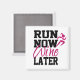 Imán divertido que dice en letras negras y burdeos "CORRE AHORA Vino MÁS TARDE" con una corredora rosa al lado. Estos serían un gran regalo para la persona que corre en tu vida. ¡Adelante, pon una SONRISA en su cara!