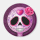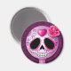 Este bonito cráneo de azúcar morado está decorado con remolinos tribales y gotas de un gran corazón en medio de la frente. Una única rosa rosa se sienta en el costado del cráneo redondo justo encima de los grandes ojos negros. Los pedales de flores violetas rodean los ojos y la boca tiene puntos que la hacen subir por el costado de la mejilla. El cráneo se sienta sobre un fondo violeta profundo creando un hermoso contraste. Este diseño de imán es un ejemplo adorable de este símbolo del Día de los Muertos.