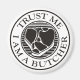 Créeme, soy un carnicero escrito dentro de un círculo con un filete de hueso.