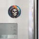Un imán con un ilustracion de un esqueleto usando una chaqueta encapuchada con el gorra de una bruja naranja encima. Luna brillante en la parte de atrás con un solo bate volando cerca. Divertido diseño de Halloween del otoño.