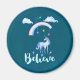 Un imán con un lindo ilustracion. Un unicornio acuarela bajo un arcoiris con nubes onduladas y estrellas colgantes. La tipografía dice Believe. Está situado sobre un fondo verde azul oscuro.