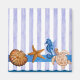 Diseño original pintado en acuarela por Sandra Gale, con estrellas de pescado, caballo de mar, tortuga y conchas sobre un fondo de rayas azules translúcidas verticales. Excelente diseño para el verano, casas de playa, bungalows o para todo aquel que ame la playa, el océano o el pescado.