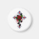 Cruz de plata con rosa roja y hojas negras sobre fondo blanco.