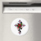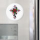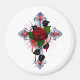 Cruz de plata con rosa roja y hojas negras sobre fondo blanco.