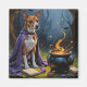 Entrar en una mágica noche de Halloween con esta pintoresca pintura al óleo con un adorable cachorro vestido con un mini manto de bruja, sentado al lado de un caldero burbujeante en un oscuro bosque. Rodeada de pociones brillantes, antiguos libros de ortografía y brillantes chispas mágicas, la escena está llena de misterio y encanto. Las ricas texturas de pintor y los profundos tonos de Halloween crean una acogedora atmósfera encantada perfecta para los amantes de la temporada espeluznante.