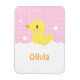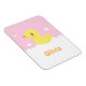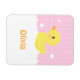 Un diseño con un lindo pato de goma amarillo en ducha y jabón. Numerosas burbujas en la ducha y un fondo de pared de azulejos rosas dulces en el baño. ¡Dulce y adorable para las niñas! Personaliza fácilmente con el nombre del niño.