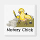Anuncie su negocio de notario móvil o agente de firma de préstamos con un toque de humor. Un diseño caprichoso presenta una linda chica amarilla rodeada de montones de documentos y una botella de tinta a quemarropa. Está sosteniendo un delicado edredón de plumas amarillas, bajo el eslogan "Notary Chick". Es un gran regalo para cualquier notario profesional que brinde un servicio valioso al público.