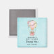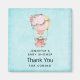 Bebé ducha gracias imán con un diseño adorable con un ilustracion acuático. Un globo de aire caliente decorado con flores bonito rojas y rosas. Un lindo oso bebé blanco se sienta en la canasta. Fondo azul claro.