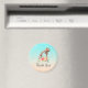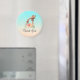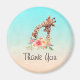 Un imán de agradecimiento con un lindo dibujo en acuarelas de una madre y una jirafa de bebé. La jirafa madre está descansando su cabeza sobre la jirafa del bebé, amorosa y adorable. un ramo de flores color agua rosa, amarillo, verde y colocado debajo de este querido par. Fondo degradado creado con un delicado color azul turquesa que se funde en un color marrón arenoso.