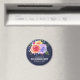 Un imán para guardar la fecha de cumpleaños con un bonito ramo de rosas en acuarela con ramitas, hojas y ramas juntas en un colorido arreglo floral. Fondo azul marino.
