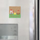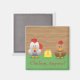 El imán de frigorífico colorido viene con un lindo personalizado de pollo amarillo, gallina marrón y gallo blanco y un fondo de grano de madera y un mensaje personalizable. El mensaje actual dice "Pollo, ¿alguien?