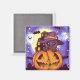 Este diseño presenta un gato de bruja encima de una calabaza gigante, con un fondo azul/violeta con dos fantasmas