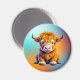 Adorable imán lindo bebé de vaca en las tierras altas con un fondo azul y naranja.