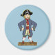Un muchacho vestido de pirata lleva un largo abrigo y un gorra pirata negro adornado con cráneo y huesos cruzados en esta obra original de Richard H. Fay.