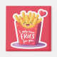 A cute and colorful cartoon illustration of a red French fries carton with a happy kawaii smiling face. The design features a floating red heart and the romantic funny pun quote "I only have FRIES for you". The image has a white sticker border, making it perfect for Valentine's Day greeting cards, fast food lovers, and humorous romantic gifts. Isolated design.