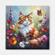 This magnet has a cute whimsical colorful folk art cat sitting in flowers and surrounded by butterflies done in an impasto style.