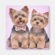 This charming illustration features an adorable Yorkshire Terrier couple sitting side by side against a soft blush pink background. With their signature silky coats, upright ears, compact faces, and alert expressions, this artwork accurately captures the beloved look of the Yorkie breed. Coordinating floral accessories—a floral bow tie for him and a matching floral crown for her—add a sweet, romantic Valentine touch while keeping the design elegant and breed-true.