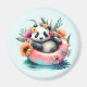 Un imán con una adorable imagen veraniega. Un diseño acuático con un panda blanco y negro sentado en una junta de natación en el agua. Rodeado de flores silvestres de bonito. Un oso totalmente frío.