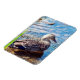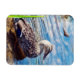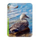 Fotografía de una mujer pato mallard parada en la zona poco profunda de un estanque, con olas de agua alejándose de ella en movimiento circular. Copyright Kimberly J Tilley.