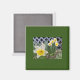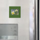 un verde oscuro, 2" , un imán cuadrado, con una imagen de bonitos folletos amarillos, en el medio.