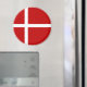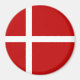 La bandera roja y blanca de Dinamarca, o Dannebrog, tiene una cruz nórdica o escandinava. El rojo es el fondo, la cruz es blanca. La bandera danesa se muestra aquí en un imán redondo.