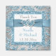 Este imán de agradecimiento para los regalos de boda con patrón de damasco floral con brillo FALSO de color gris plateado, azul hielo y blanco tiene una cinta y un lazo IMPRIMIDOS de color azul con un par de joyas de diamantes y brillo FALSO IMPRIMIDOS con corazones unidos que coinciden con las invitaciones de boda que se muestran a continuación. El texto es personalizable para que puedas cambiarlo a lo que desees. Si necesitas otros artículos que coincidan con este diseño, por favor envía tu solicitud a niteowlstudio@gmail.com.